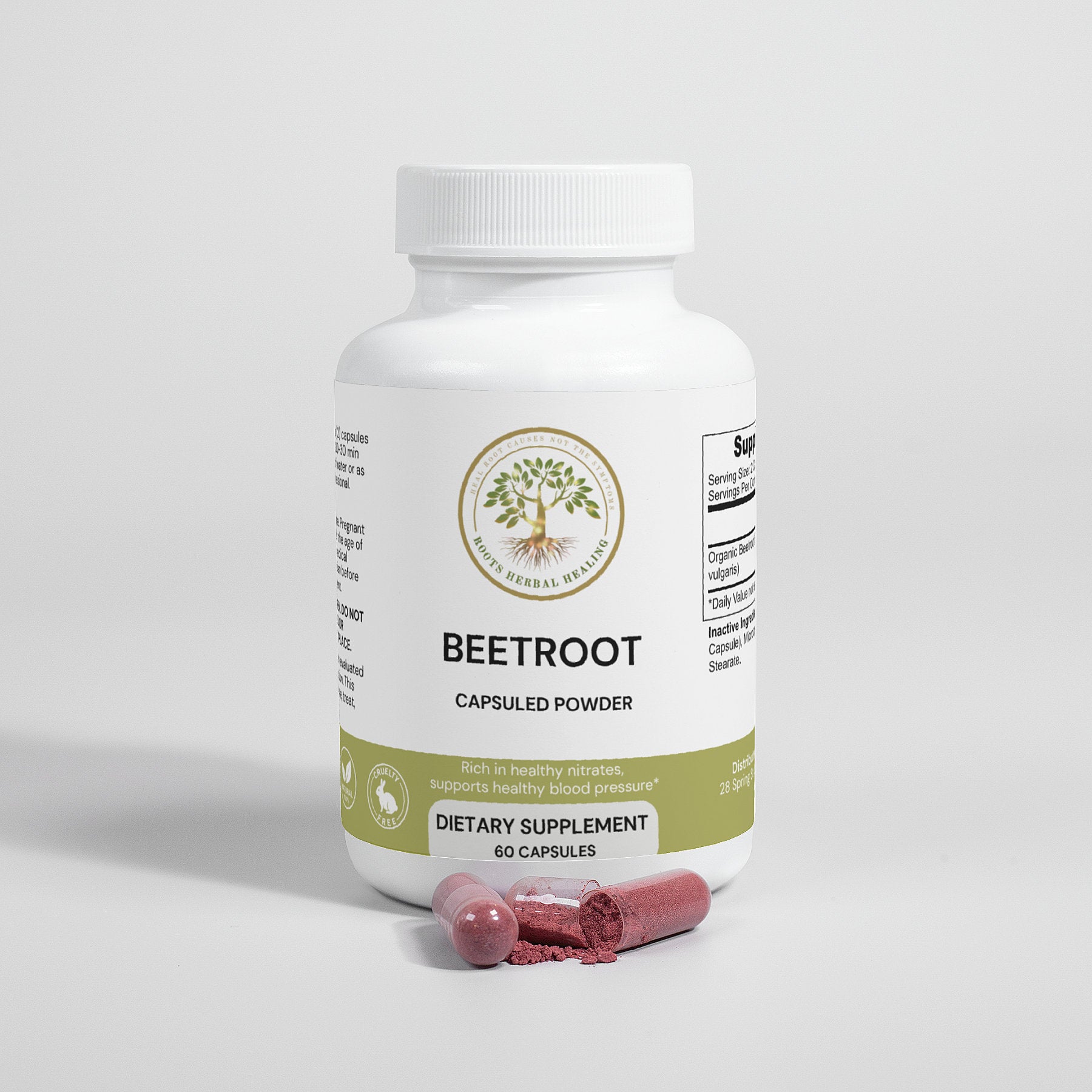 Ingredients: Organic Beetroot Powder (beta vulgaris), Cellulose (Vegetable Capsule), Microcrystalline Cellulose, Magnesium Stearate.
